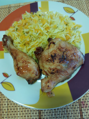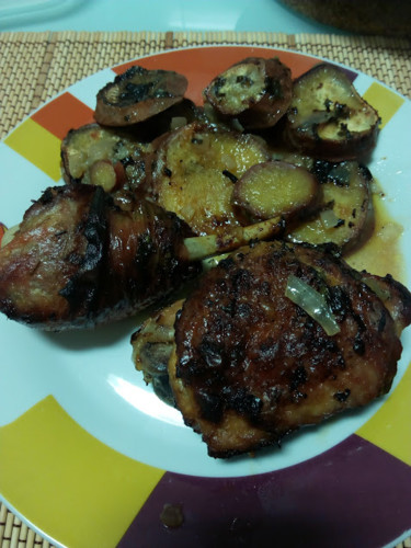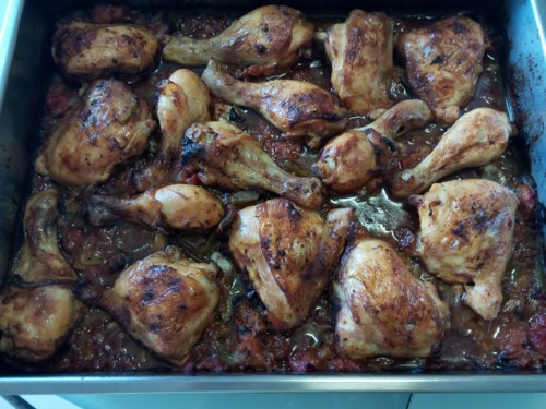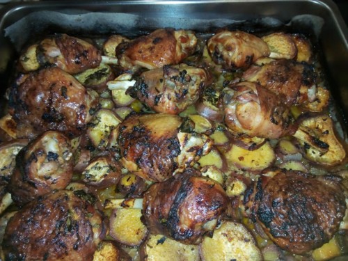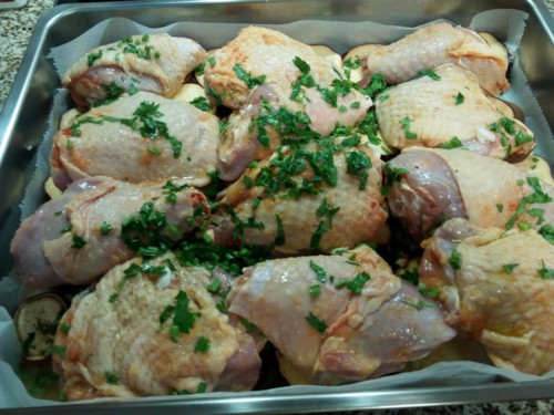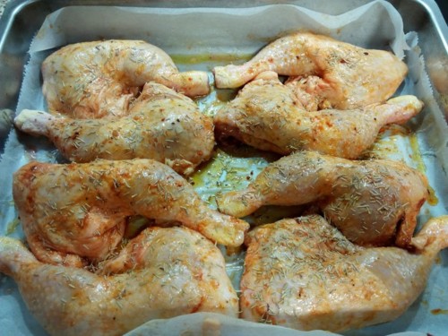 As coxas foram parar a um tabuleiro de forno, temperei e deixei no frigorífico para no dia seguinte assar.