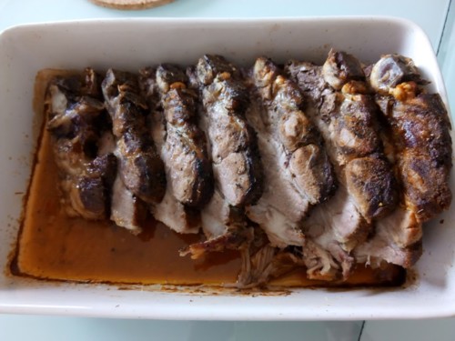 Levar a forno pré aquecido a 180º, com a parte da pele virada para cima. Demora cerca de 2h a assar. Convém ir regando a carne com o molho que se vai formando no tabuleiro (eu usei um pincel, e em intervalos de 30 minutos ia pincelando a carne). Pode ser necessário acrescentar um pouco de água ao fundo do tabuleiro, caso esteja a secar e a ficar sem molho.