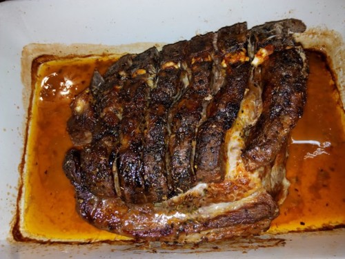 Findo o tempo, retirar a folha de alumínio, aumentar a temperatura do forno para deixar o entrecosto tostar um pouco, vigiando até estar no ponto que vos agrade.